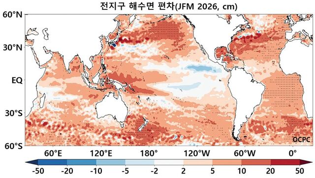 올 1~3월 전 지구 해수면 높이 편차 전망. 절대 해수면 높이(Absolute Dynamic Topography·ADT)는 인공위성 관측을